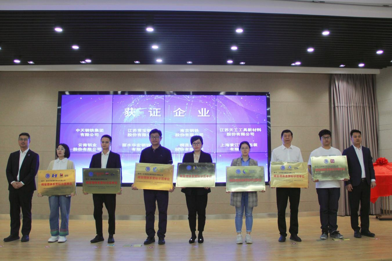 . 活动现场举行了2025年首批EATNS碳管理体系评定证书颁证仪式,为中天钢铁集团、江苏常宝钢管、南京钢铁、云南铝业、上海紫江、丽水华宏、江苏天工、桐昆集团等8家企业颁发了证书。中天钢铁集团、江苏常宝钢管和南京钢铁凭借卓越的碳管理实践获得研究院颁发的“碳管理体系金奖”。
