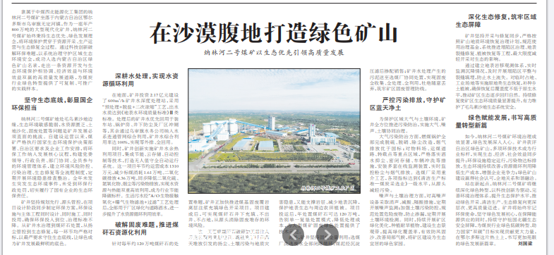 如今,纳林河二号煤矿环境治理成效显著,绿色发展深入人心。矿井获评自治区绿色矿山,多项环保技术成为行业标杆,实现生态、经济、社会效益同步提升:环保设施稳定运行,污染物达标排放,生态环境持续改善;资源循环利用降低生产成本,增强企业竞争力;绿色矿山建设赢得社会认可,企地关系和谐融洽。